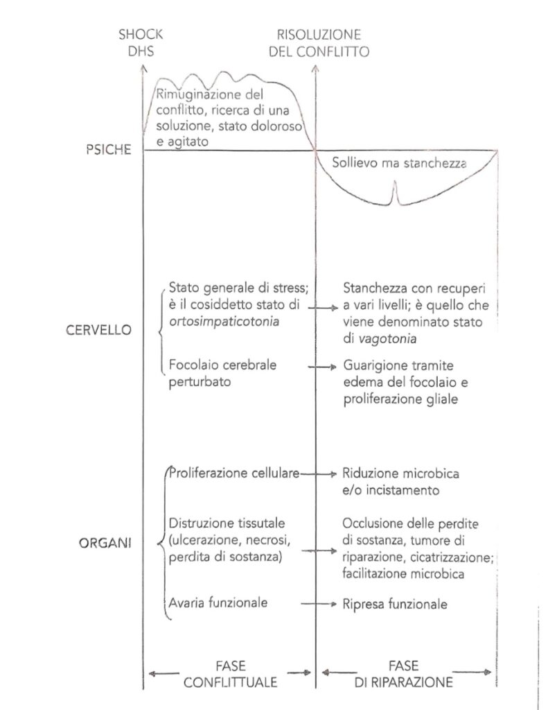 Se e quando il conflitto viene risolto, la mente si rilassa, prova sollievo compaiono stanchezza, spossatezza, infiammazione, possibile febbre e muco, bisogno di riposo. Il cervello e corpo passano alla fase di riparazione manifestando sintomi evidenti. Nel cervello appaiono edemi nelle zone colpite. Negli organi avvengono modificazioni rilevabili.